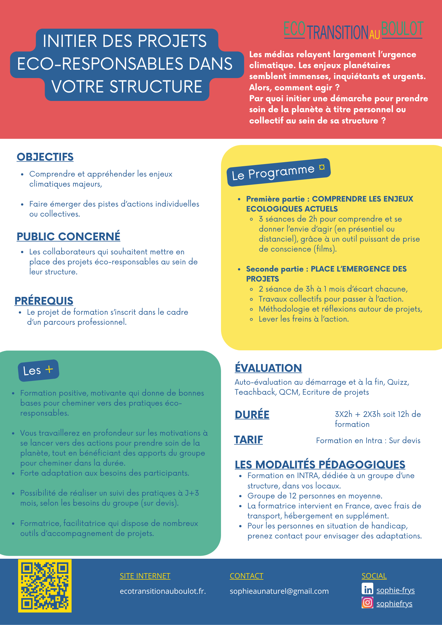 - Quizz, Teachback, travaux collectifs, initier la mise en place d’actions en transition écologique.